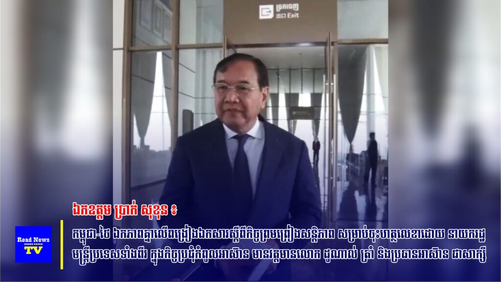 រាជរដ្ឋាភិបាលកម្ពុជា-ថៃ បានឯកភាពគ្នាលើពង្រៀងឯកសារមួយ ស្តីពីកិច្ចព្រមព្រៀងសន្តិភាព សម្រាប់ការចុះហត្ថលេខា ដោយនាយករដ្ឋមន្រ្តីប្រទេសទាំងពីរ ដោយមានការចូលរួមជាសាក្សីពីប្រធានាធិបតីអាមេរិក ដូណាល់​ ត្រាំ និងនាយករដ្ឋមន្រ្តីម៉ាឡេស៊ី ដែលប្រធានអាស៊ាន នៅក្នុងកិច្ចប្រជុំកំពូលអាស៊ាន ចុងខែតុលានេះ។ កាចរចាលើឯកសារនេះ បានធ្វើឡើងជាយូរថ្ងៃមកហើយ ប៉ុន្តែទើបនឹងសម្រេច នៅថ្ងៃទី១៧ ខែតុលា​ ឆ្នាំ២០២៥ នៅប្រទេសម៉ាឡេស៊ី។ នេះបើតាមការបញ្ជាក់របស់ ឯកឧត្តមឧបនាយករដ្ឋមន្រ្តី ប្រាក់ សុខុន រដ្ឋមន្រ្តីក្រសួងការបរទេស និងសហប្រតិបត្តិការអន្តរជាតិ ក្នុងកិច្ចសម្ភាសជាមួយនឹងទទក ក្រោយបញ្ចប់ការចរចា។ ឯកឧត្តមឧបនាយករដ្ឋមន្រ្តី បានបញ្ជាក់ដូច្នេះថា៖ «ម្សិលមិញនេះ (ថ្ងៃទី១៧ ខែតុលា) យើងបានជួបគ្នាដោយផ្ទាល់ ហើយចរចាគ្នារហូតដល់យប់ ហើយបានឯកភាពគ្នាលើឯកសារមួយ ដែលសង្ឃឹមថា ឯកសារនេះនឹងត្រូវបានចុះហត្ថលេខាដោយ នាយករដ្ឋមន្រ្តីប្រទេសទាំងពីរកម្ពុជា-ថៃ ដោយមានការចុះហត្ថលេខាជាសាក្សីដោយ ឯកឧត្តម ប្រធានាធិបតីសហរដ្ឋអាមេរិក ដូណាល់ ត្រាំ ដែលនឹងមកចូលរួមក្នុងកិច្ចប្រជុំកំពូលអាស៊ាន និងនាយករដ្ឋមន្រ្តីម៉ាឡេស៊ី ដែលជាប្រធានអាស៊ាន»។ កិច្ចព្រមព្រៀង ឬឯកសារស​ន្តិភាពមួយនេះ ត្រូវបានប្រមុខការទូតកម្ពុជា អះអាងថា វានឹងក្លាយទៅជាឯកសារដែលផ្តល់នូវភាពរឹងមាំដែលនាំប្រទេសទាំងព​ីរ ទៅរកភាពប្រក្រតីភាពឡើងវិញនូវទំនាក់ទំនងរវាងប្រទេស និងប្រជាជនកម្ពុជា-ថៃ ហើយក៏ជាដំណើរឆ្ពោះទៅរកការរស់នៅដោយសន្តិភាព ក្នុងនាមជាអ្នកជិតខាងជាមួយគ្នា ព្រមទាំងបង្កើតឱកាសនានាដើម្បីប្រទេសទាំងពីររស់នៅដោយសុខសន្តិភាព និងវិបុលភាព។ ក្រៅពីការប្តេជ្ញាចិត្ត និងការអះអាងជាថ្មីរវាងប្រទេសទាំងពីរ ក្នុងការគោរព Read more