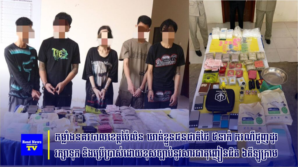 កម្លាំងនគរបាលខេត្តប៉ៃលិន ឃាត់ខ្លួនជនជាតិថៃ ៥នាក់ ករណីជួញដូរ រក្សាទុក និងប្រើប្រាស់ដោយខុសច្បាប់នូវសារធាតុញៀនជិត ៦គីឡូក្រាម