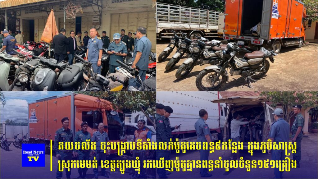 កម្លាំងគយចល័តបានចុះបង្ក្រាបទីតាំងលក់ម៉ូតូគេចពន្ធចំនួន ៩ កន្លែង នៅក្នុងភូមិសាស្ត្រស្រុកមេមត់ ខេត្តត្បូងឃ្មុំ កាលពីព្រឹកថ្ងៃទី ២៦ កញ្ញា ឆ្នាំ ២០២៥ រកឃើញម៉ូតូគ្មានពន្ធនាំចូលចំនួន ១៥១ គ្រឿង ហើយបានចាប់ឃាត់យកមកអនុវត្តតាមនីតិវិធីច្បាប់។