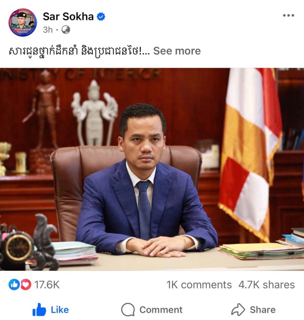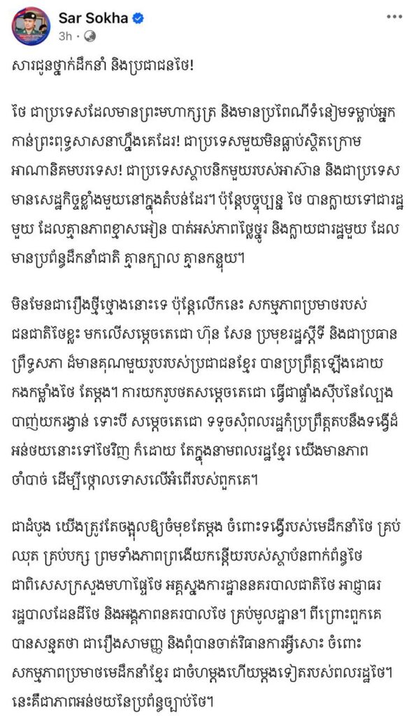 តាមរយៈផេកហ្វេសប៊ុកផ្លូវការ នាល្ងាចថ្ងៃទី៩ ខែតុលា ឆ្នាំ២០២៥ ឯកឧត្តមអភិសន្តិបណ្ឌិត ស សុខា ឧបនាយករដ្ឋមន្ត្រី រដ្ឋមន្ត្រីក្រសួងមហាផ្ទៃ បានផ្ញើសារ ៤ចំណុច ទៅកាន់ថ្នាក់ដឹកនាំ និងប្រជាជនថៃ បន្ទាប់ពីប្រជាជន និងកងកម្លាំងថៃមួយចំនួន បានយករូបថតសម្តេចតេជោ ហ៊ុន សែន ទៅធ្វើជាផ្ទាំងស៊ីប នៃល្បែងបាញ់យករង្វាន់ កាលពីពេលថ្មីៗនេះ។