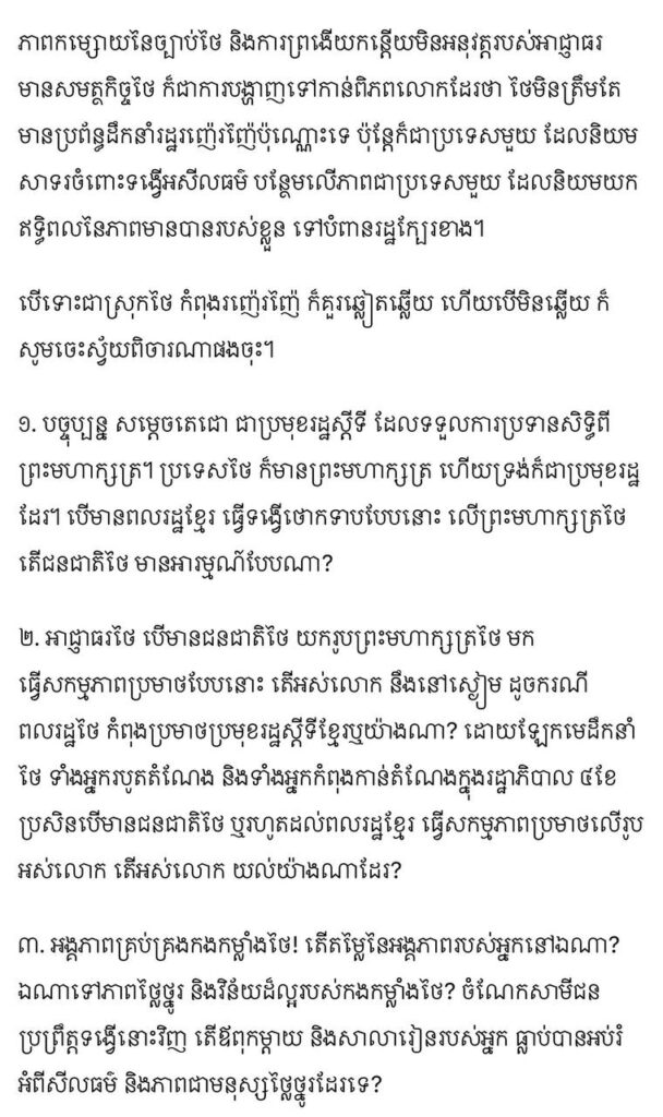 ២. អាជ្ញាធរថៃ បើមានជនជាតិថៃ យករូបព្រះមហាក្សត្រថៃ មកធ្វើសកម្មភាពប្រមាថបែបនោះ តើអស់លោក នឹងនៅស្ងៀម ដូចករណីពលរដ្ឋថៃ កំពុងប្រមាថប្រមុខរដ្ឋស្ដីទីខ្មែរឬយ៉ាងណា? ដោយឡែកមេដឹកនាំថៃ ទាំងអ្នករបូតតំណែង និងទាំងអ្នកកំពុងកាន់តំណែងក្នុងរដ្ឋាភិបាល ៤ខែ ប្រសិនបើមានជនជាតិថៃ ឬរហូតដល់ពលរដ្ឋខ្មែរ ធ្វើសកម្មភាពប្រមាថលើរូបអស់លោក តើអស់លោក យល់យ៉ាងណាដែរ?