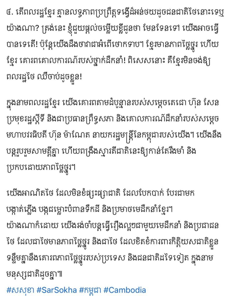 ៤. តើពលរដ្ឋខ្មែរ គ្មានលទ្ធភាពប្រព្រឹត្តទង្វើដ៏អន់ថយដូចជនជាតិថៃនោះទេឬយ៉ាងណា? ត្រង់នេះ ខ្ញុំជួយផ្ដល់ចម្លើយខ្លីជូនថា មែនទែនទៅ យើងអាចធ្វើបានទេតើ! ប៉ុន្តែយើងដឹងថាវាជាអំពើថោកទាប។ ខ្មែរមានភាពថ្លៃថ្នូរ ហើយខ្មែរ គោរពគោលការណ៍របស់ថ្នាក់ដឹកនាំ! ពិសេសនោះ គឺខ្មែរមិនចង់ឱ្យពលរដ្ឋថៃ ឈឺចាប់ដូចខ្លួន!