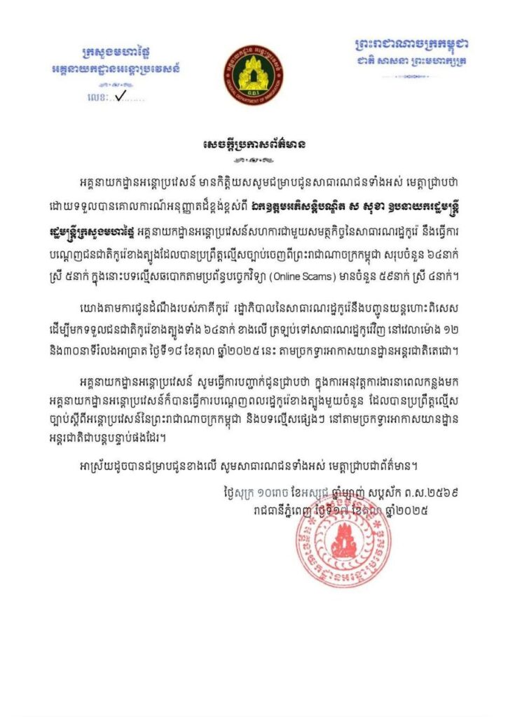 មន្ត្រីនៃអគ្គនាយកដ្ឋានអន្តោប្រវេសន៍ នៃក្រសួងមហាផ្ទៃប្រទេស កម្ពុជានៅយប់ថ្ងៃទី១៧ ខែតុលា ឆ្នាំ២០២៥ បានបញ្ជូនជនជាតិកូរ៉េសរុបចំនួន ៦៤នាក់ ក្នុងនោះមានស្ត្រីចំនួន៥នាក់ ដែលជាប់ពាក់ព័ន្ធនឹងការឆបោកតាម ប្រព័ន្ធបច្ចេកវិទ្យា ឱ្យត្រឡប់ទៅប្រទេសដើមរបស់ពួកគេវិញ ដើម្បីឱ្យរដ្ឋាភិបាលសាធារណរដ្ឋកូរ៉េ ចាត់វិធានការ និងអនុវត្តនីតិវិធីបន្ត។