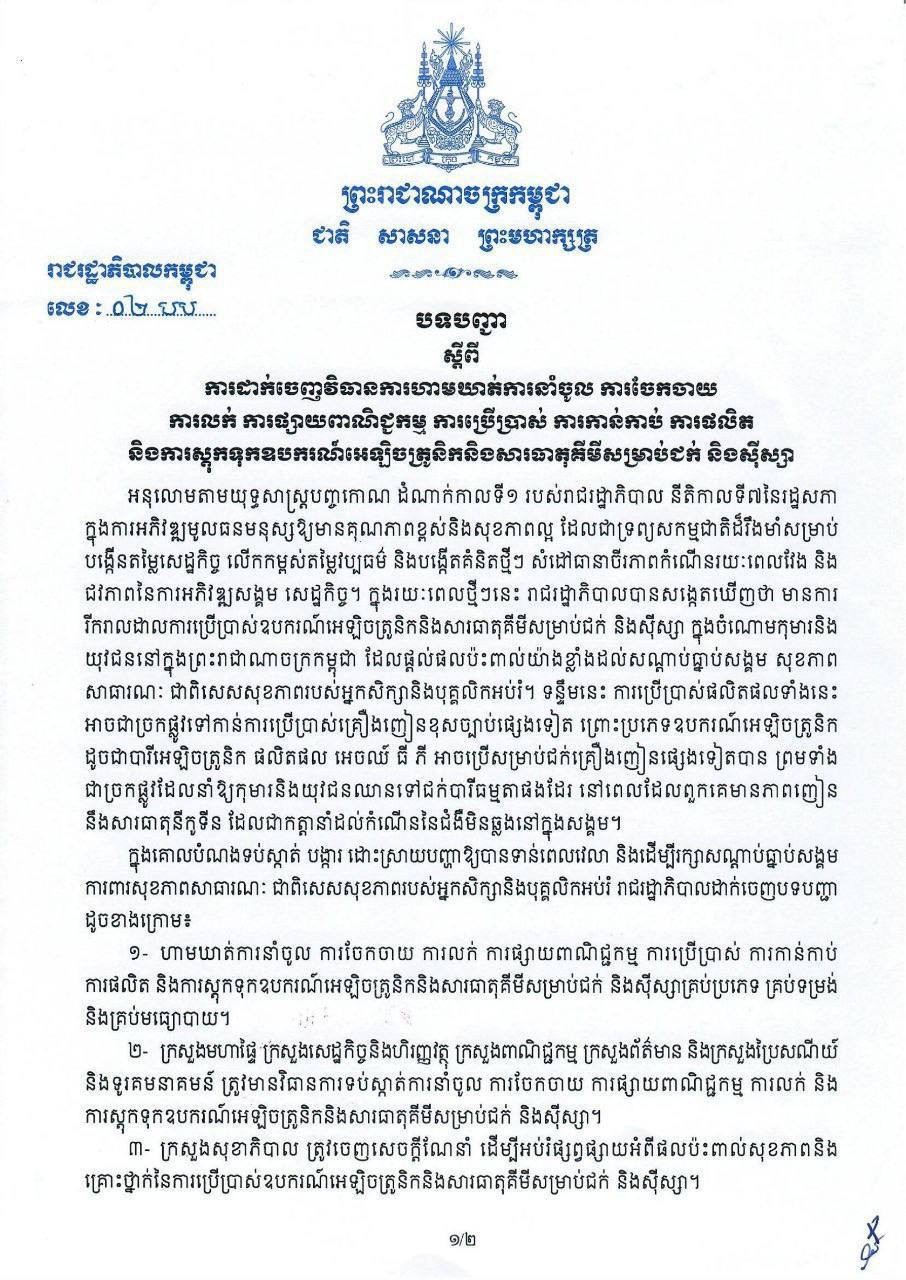 ប្រមុខរាជរដ្ឋាភិបាលកម្ពុជា សម្តេចបវរធិបតី ហ៊ុន ម៉ាណែត នាយករដ្ឋមន្ត្រី នៃកម្ពុជា ចេញបទបញ្ជា ស្តីពីការដាក់ចេញវិធានការហាមឃាត់ការនាំចូល ការចែកចាយ ការលក់ ការផ្សាយពាណិជ្ជកម្ម ការប្រើប្រាស់ ការកាន់កាប់ ការផលិត និងការស្តុកទុកឧបករណ៍អេឡិចត្រូនិកនិងសារធាតុគីមីសម្រាប់ជក់ និងស៊ីស្សា។ នេះបើយោងតាមលិខិតបទបញ្ជារបា់រាជរដ្ឋាភិបាលកម្ពុជា ដែលបានចះុហត្ថលេខា ដោយសម្តេចបវរធិបតី ហ៊ុន ម៉ាណែត នាយករដ្ឋមន្ត្រី នៃកម្ពុជា នៅថ្ងៃទី ២១ តុលា ឆ្នាំ២០២៥។