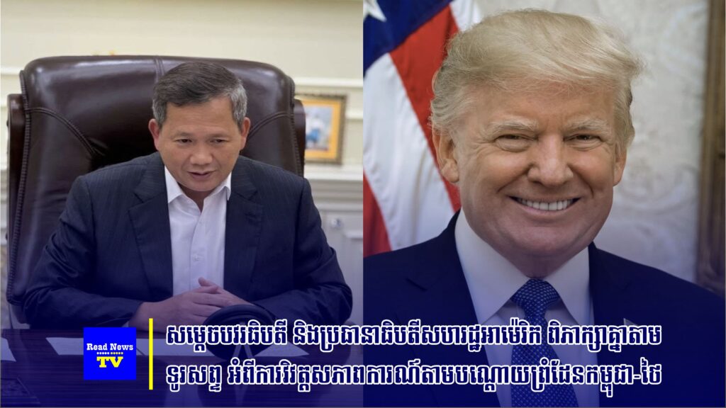 សម្តេចបវរធិបតី ហ៊ុន ម៉ាណែត នាយករដ្ឋមន្ត្រីកម្ពុជា បានជួបពិភាក្សាតាមទូរសព្ទជាមួយ លោក Donald J. Trump ប្រធានាធិបតីនៃសហរដ្ឋអាមេរិក ដើម្បីពិភាក្សាអំពីការវិវត្តសភាពការណ៍តាមបណ្តោយព្រំដែនកម្ពុជា-ថៃ ក្នុងគោលបំណងបន្តជំរុញការអនុវត្តកិច្ចព្រមព្រៀងសន្តិភាពរវាងកម្ពុជានិងថៃ”។ នេះបេីយោងតាមរយៈបណ្តាញសង្គមផ្លូវការសម្តេចបវរធិបតី ហ៊ុន ម៉ាណែត នាយប់ថ្ងៃទី១៤ វិច្ឆិកា ឆ្នាំ២០២៥។