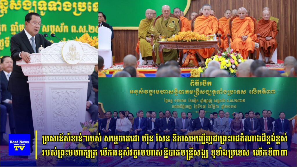 * សម្ដេចតេជោ ហ៊ុន សែន បានបង្ហាញក្ដីសោមនស្ស និងកិត្តិយសបំផុត ដែលបានព្រះមហាក្សត្រទ្រង់ព្រះរាជនុញ្ញាតដ៏ខ្ពង់ខ្ពស់ ព្រះរាជតំណាងបើកអនុសំវច្ចរមហាសន្និបាតមន្ដ្រីសង្ឃទូទាំងប្រទេស លើកទី៣៣ ឆ្នាំ២០២៥