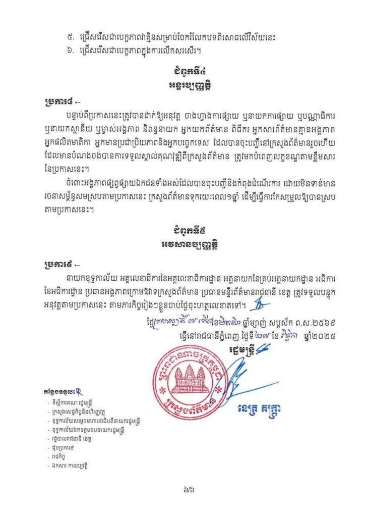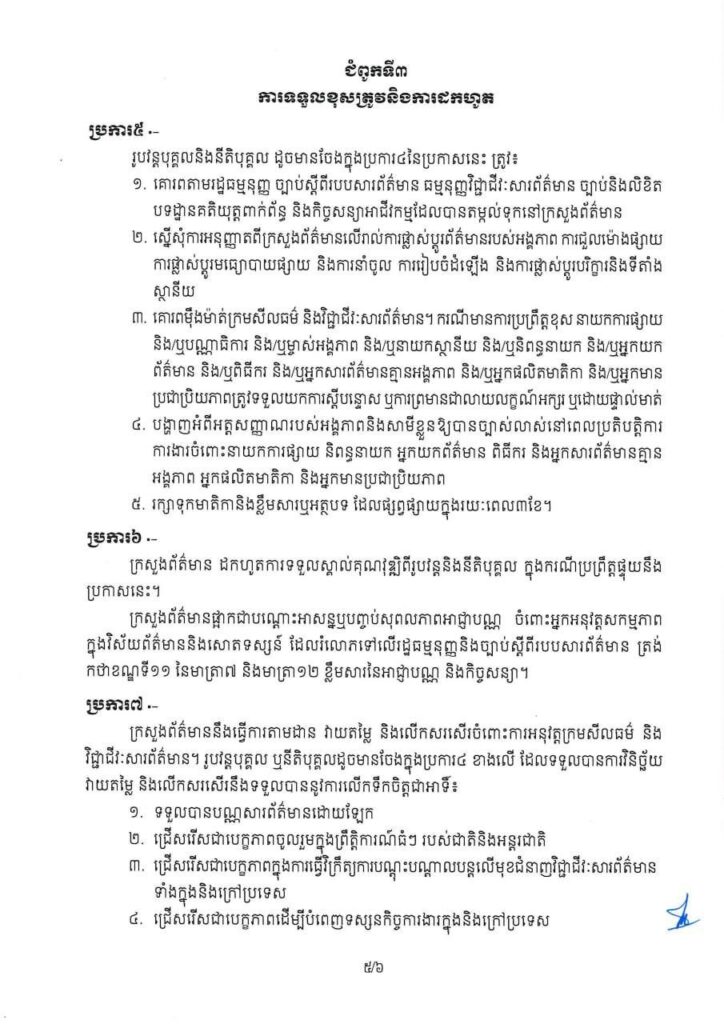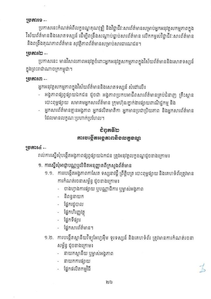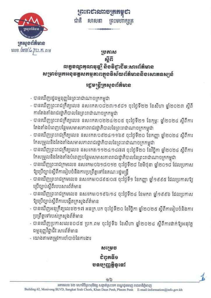 ក្រោមការអនុវត្តប្រកាសថ្មីរបស់ក្រសួងព័ត៌មាន ស្តីពី «លក្ខខណ្ឌគុណវុឌ្ឍិ និងវិជ្ជាជីវៈសារព័ត៌មានសម្រាប់អ្នកអនុវត្តសកម្មភាពក្នុងវិស័យព័ត៌មាននិងសោតទស្សន៍» ថ្ងៃទី២៧ ខែវិច្ឆិកា ឆ្នាំ២០២៥ ការស្នើបើកអាជ្ញាបណ្ណព័ត៌មាន ជាពិសេស សារព័ត៌មានអនឡាញដែលសម្បូរបែបនៅក្នុងប្រទេសកម្ពុជា នឹងមិនងាយស្រួលដូចមុនទៀតឡើយ។