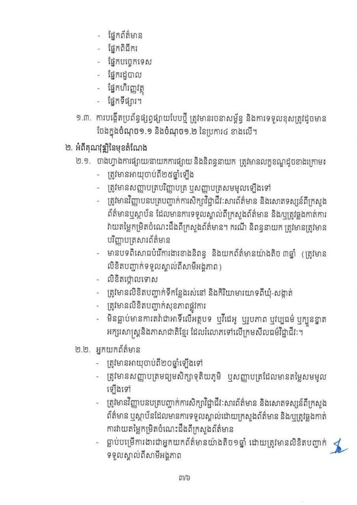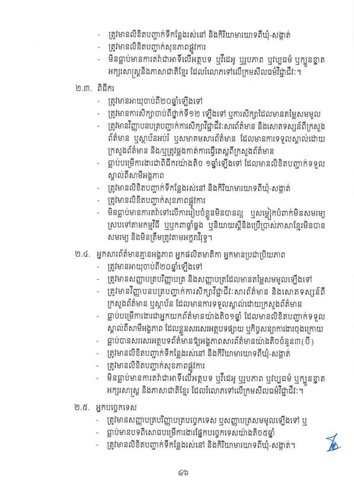 សម្រាប់អ្នកសារព័ត៌មាន ពិធីករពិធីការិនី ក៏មានលក្ខខណ្ឌតម្រូវដូចជា យ៉ាងហោចណាស់ក៏ត្រូវតែរៀនជាប់បាក់ឌុបដែរ។ ដើម្បីបំពេញតួនាទីនេះបាន ពួកគេត្រូវមានថែមទៀតនូវវិញ្ញាបនបត្របញ្ជាក់ការសិក្សាវិជ្ជាជីវៈសារព័ត៌មាន និងសោតទស្សន៍ពីក្រសួងព័ត៌មាន ឬស្ថាប័នដែលមានការទទួលស្គាល់ដោយក្រសួងព័ត៌មាន និង/ឬត្រូវឆ្លងកាត់ការវាយតម្លៃកម្រិតចំណេះដឹងពីក្រសួងព័ត៌មាន ធ្លាប់បម្រើការងារជាអ្នកយកព័ត៌មានយ៉ាងតិច១ឆ្នាំ។ ដោយឡែកសម្រាប់ អ្នកសារព័ត៌មានគ្មានអង្គភាព អ្នកផលិតមាតិកា អ្នកមានប្រជាប្រិយភាពវិញនោះ ត្រូវតែកំណត់អាយុចាប់ពី២០ឆ្នាំឡើងទៅ, មានសញ្ញាបត្របរិញ្ញាបត្រ និងសញ្ញាបត្រដែលមានតម្លៃសមមូល, មានវិញ្ញាបនបត្របញ្ជាក់ការសិក្សាវិជ្ជាជីវៈសារព័ត៌មាន និងសោតទស្សន៍ពីក្រសួងព័ត៌មាន ឬស្ថាប័នដែលមានការទទួលស្គាល់ដោយក្រសួងព័ត៌មាន, ធ្លាប់បម្រើការងារជាអ្នកយកព័ត៌មានយ៉ាងតិច១ឆ្នាំ, ធ្លាប់បានសរសេរអត្ថបទព័ត៌មានឱ្យអង្គភាពសារព័ត៌មានយ៉ាងតិចចំនួន៣ឆ្នាំ។ ទាំងអ្នកព័ត៌មាន ពិធីករ និងអ្នកផលិតមាតិកា ត្រូវតែមានលិខិតបញ្ជាក់ទីកន្លែងរស់នៅ និងកិរិយាមារយាទពីឃុំ-សង្កាត់, លិខិតបញ្ជាក់សុខភាពផ្លូវការ និងមិនធ្លាប់មានការតវ៉ាជាអាទិ៍លើអត្ថបទ ឬវីដេអូ ឬរូបភាព ឬវប្បធម៌ ឬក្បួនខ្នាត អក្សរសាស្ត្រ និងភាសាជាតិខ្មែរដែលរំលោភទៅលើក្រមសីលធម៌វិជ្ជាជីវៈឡើយ។