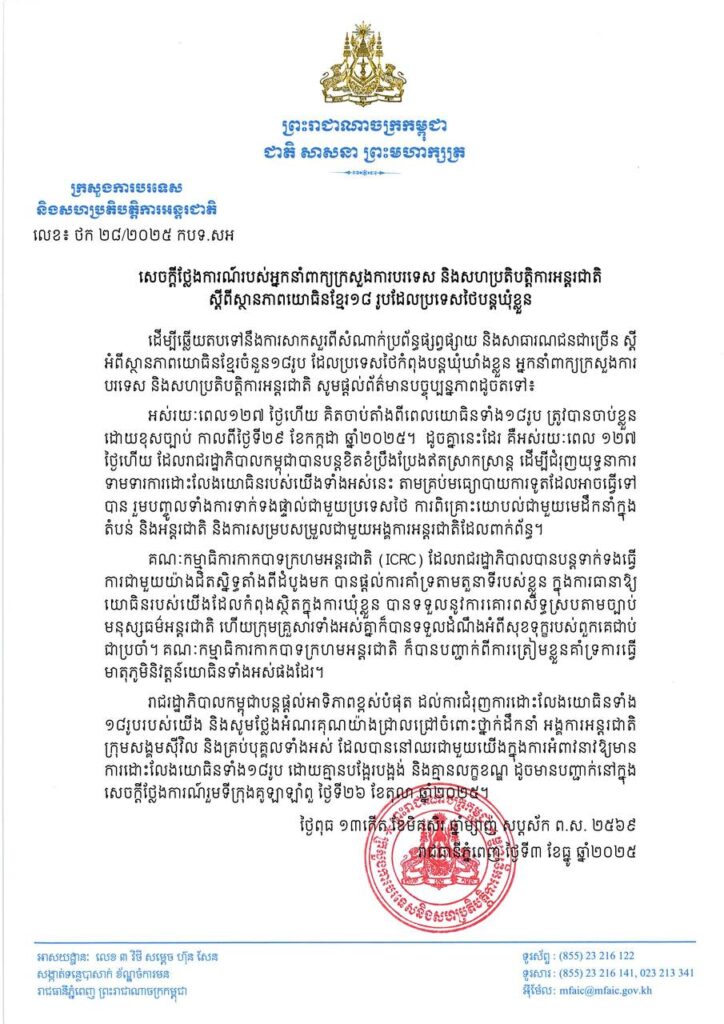 យោងតាមសេចក្តីថ្លែងការណ៍របស់អ្នកនាំពាក្យក្រសួងការបរទេស និងសហប្រតិបត្តិការអន្តរជាតិ ស្តីពីស្ថានភាពយោធិនខ្មែរ១៨ រូបដែលប្រទេសថៃបន្តឃុំខ្លួន បានឱ្យដឹងថា អស់រយៈពេល១២៧ ថ្ងៃហើយ គិតចាប់តាំងពីពេលយោធិនទាំង១៨រូប ត្រូវបានចាប់ខ្លួន ដោយខុសច្បាប់ កាលពីថ្ងៃទី២៩ ខែកក្កដា ឆ្នាំ២០២៥។ ដូចគ្នានេះដែរ គឺអស់រយៈពេល ១២៧ ថ្ងៃហើយ ដែលរាជរដ្ឋាភិបាលកម្ពុជាបានបន្តខិតខំប្រឹងប្រែងឥតស្រាកស្រាន្ត ដើម្បីជំរុញយុទ្ធនាការ ទាមទារការដោះលែងយោធិនរបស់យើងទាំងអស់នេះ តាមគ្រប់មធ្យោបាយការទូតដែលអាចធ្វើទៅ បាន រួមបញ្ចូលទាំងការទាក់ទងផ្ទាល់ជាមួយប្រទេសថៃ ការពិគ្រោះយោបល់ជាមួយមេដឹកនាំក្នុង តំបន់ និងអន្តរជាតិ និងការសម្របសម្រួលជាមួយអង្គការអន្តរជាតិដែលពាក់ព័ន្ធ។