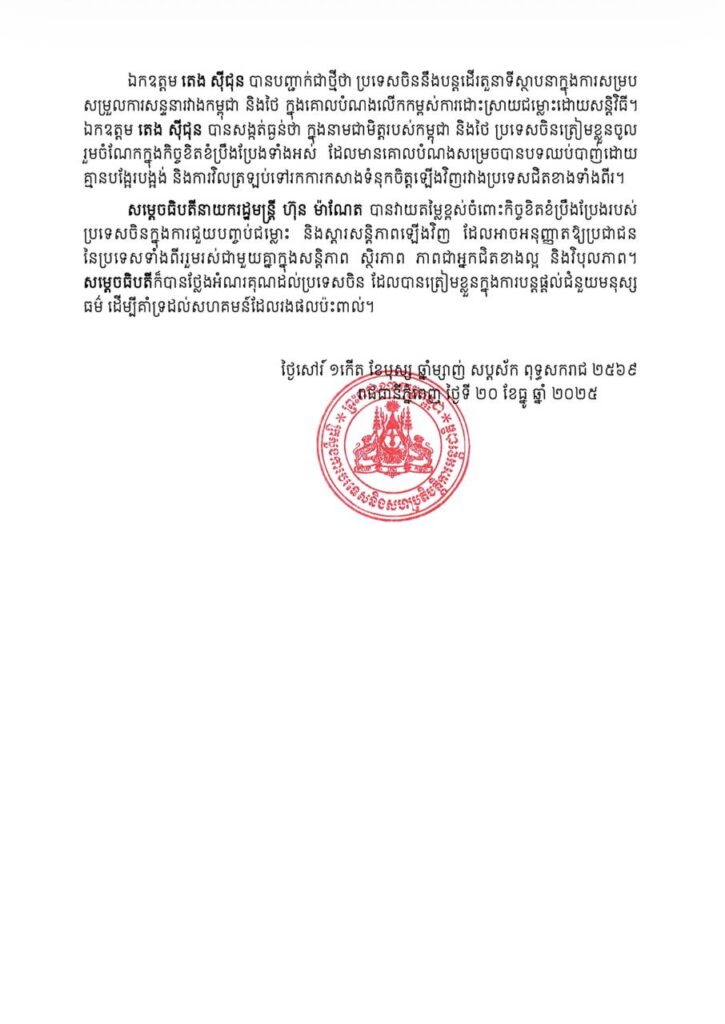 សម្តេចបវរធិបតីនាយករដ្ឋមន្ត្រី ហ៊ុន ម៉ាណែត បានវាយតម្លៃខ្ពស់ចំពោះកិច្ចខិតខំប្រឹងប្រែងរបស់ប្រទេសចិនក្នុងការជួយបញ្ចប់ជម្លោះ និងស្តារសន្តិភាពឡើងវិញ ដែលអាចអនុញ្ញាតឱ្យប្រជាជននៃប្រទេសទាំងពីររួមរស់ជាមួយគ្នាក្នុងសន្តិភាព ស្ថិរភាព ភាពជាអ្នកជិតខាងល្អ និងវិបុលភាព ។