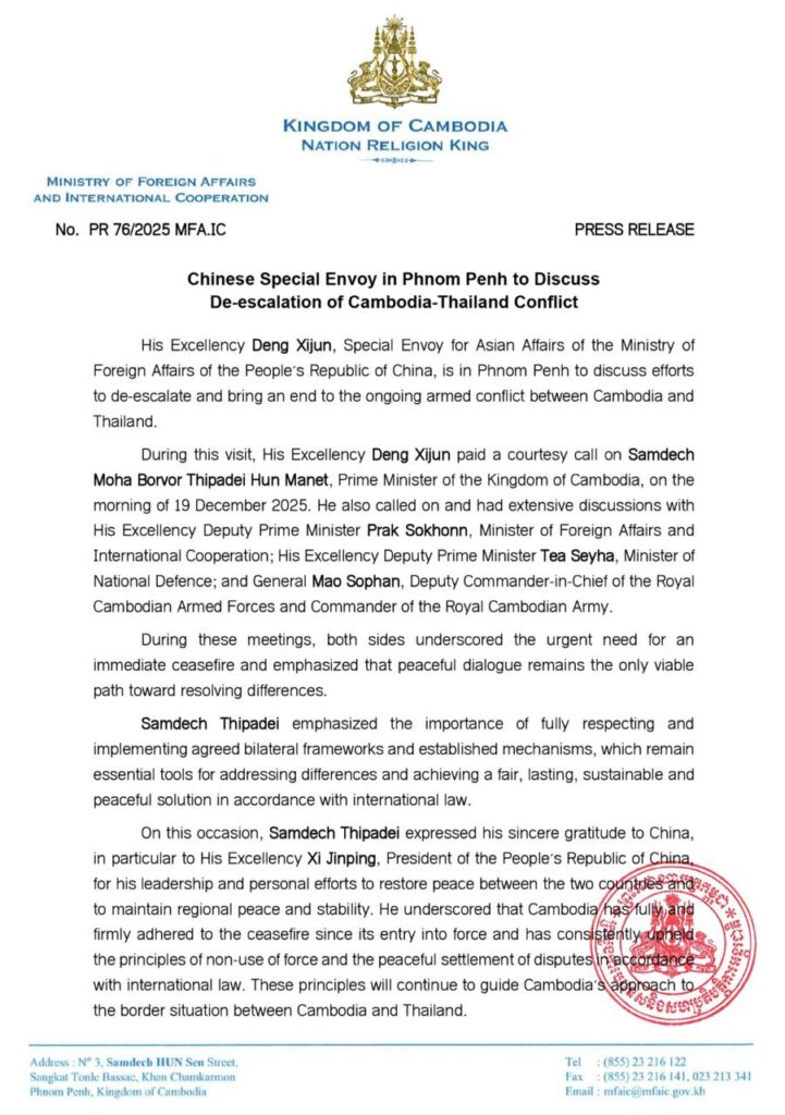 ឯកឧត្តម តេង ស៊ីយុន ប្រេសិតពិសេសទទួលបន្ទុកកិច្ចការអាស៊ី ក្រសួងការបរទេសនៃសាធារណរដ្ឋប្រជាមានិតចិន កំពុងស្ថិតនៅទីក្រុងភ្នំពេញ ដើម្បីពិភាក្សាអំពីកិច្ចខិតខំប្រឹងប្រែង ដើម្បីបន្ធូរបន្ថយកម្ដៅ និងបញ្ចប់ជម្លោះប្រដាប់អាវុធរវាងកម្ពុជា និងថៃ ។ នេះបើតាមសេចក្តីប្រកាសព័ត៌មានរបស់ក្រសួងការបទេស និងសហប្រតិបត្តិការអន្តរជាតិកម្ពុជា ។