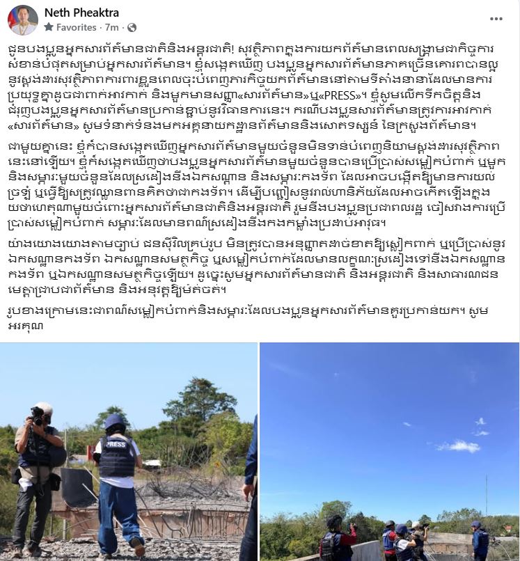 តាមរយៈបណ្តាញទំនាក់ទំនងសង្គមហ្វេសប៊ុកនារសៀលថ្ងៃទី២០ ខែធ្នូ ឆ្នាំ២០២៥ ឯកឧត្តម នេត្រ ភក្ត្រា រដ្ឋមន្រ្តីក្រសួងព័ត៌មានបានមានប្រសាសន៍ថា សុវត្ថិភាពក្នុងការយកព័ត៌មានពេលសង្គ្រាមជាកិច្ចការសំខាន់បំផុតសម្រាប់អ្នកសារព័ត៌មាន។ ចំពោះចំណុចនេះ ឯកឧត្តមសង្កេតឃើញាថា អ្នកសារព័ត៌មានភាគច្រើនគោរពបានល្អនូវស្តង់ដាសុវត្ថិភាពការពារខ្លួន ពេលចុះបំពេញភារកិច្ចយកព័ត៌មាន នៅតាមទីតាំងនានាដែលមានការប្រយុទ្ធគ្នាដូចជា ៖ ពាក់អាវកាក់ និងមួកមានសញ្ញា «សារព័ត៌មាន»ឬ«PRESS»។
