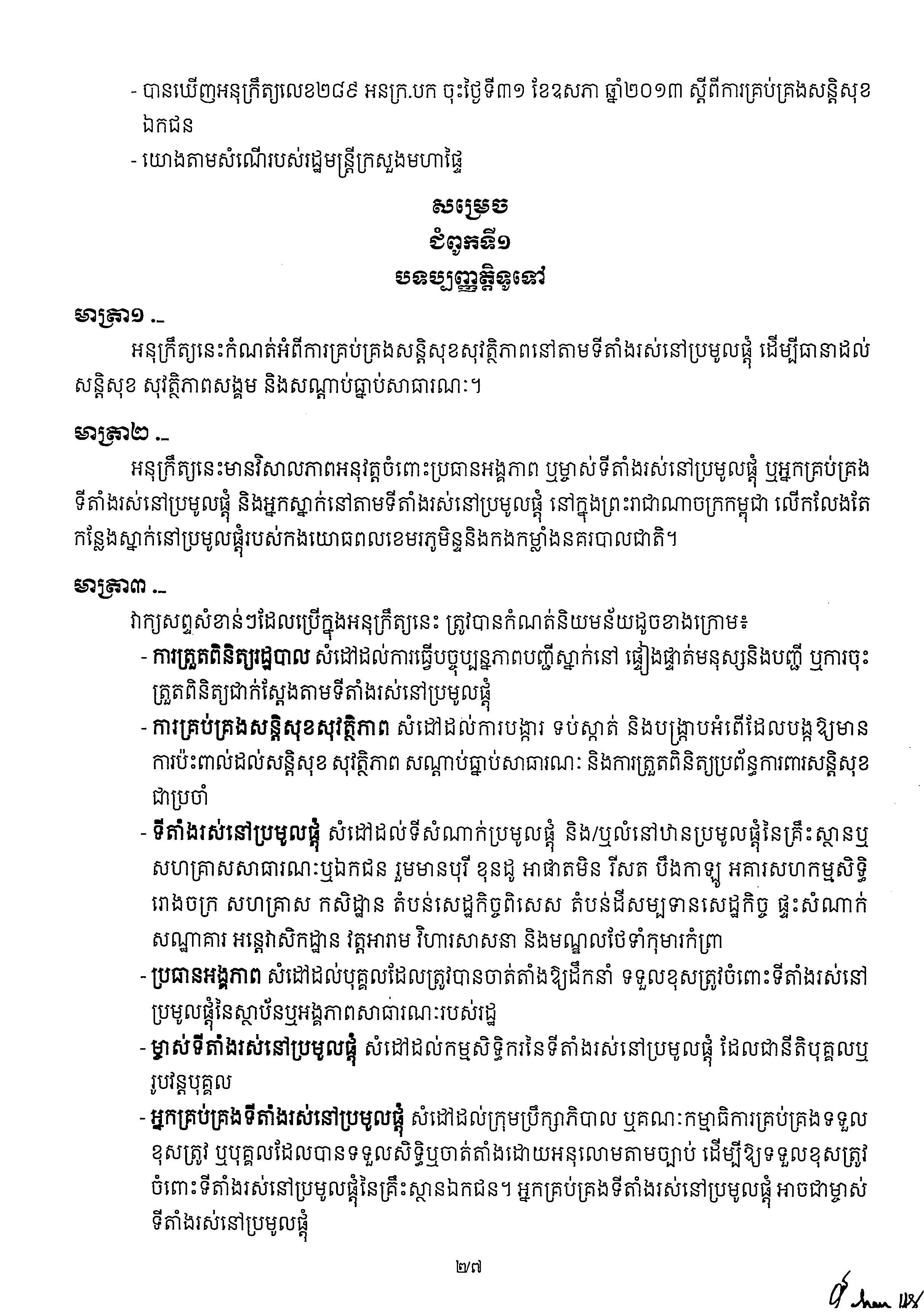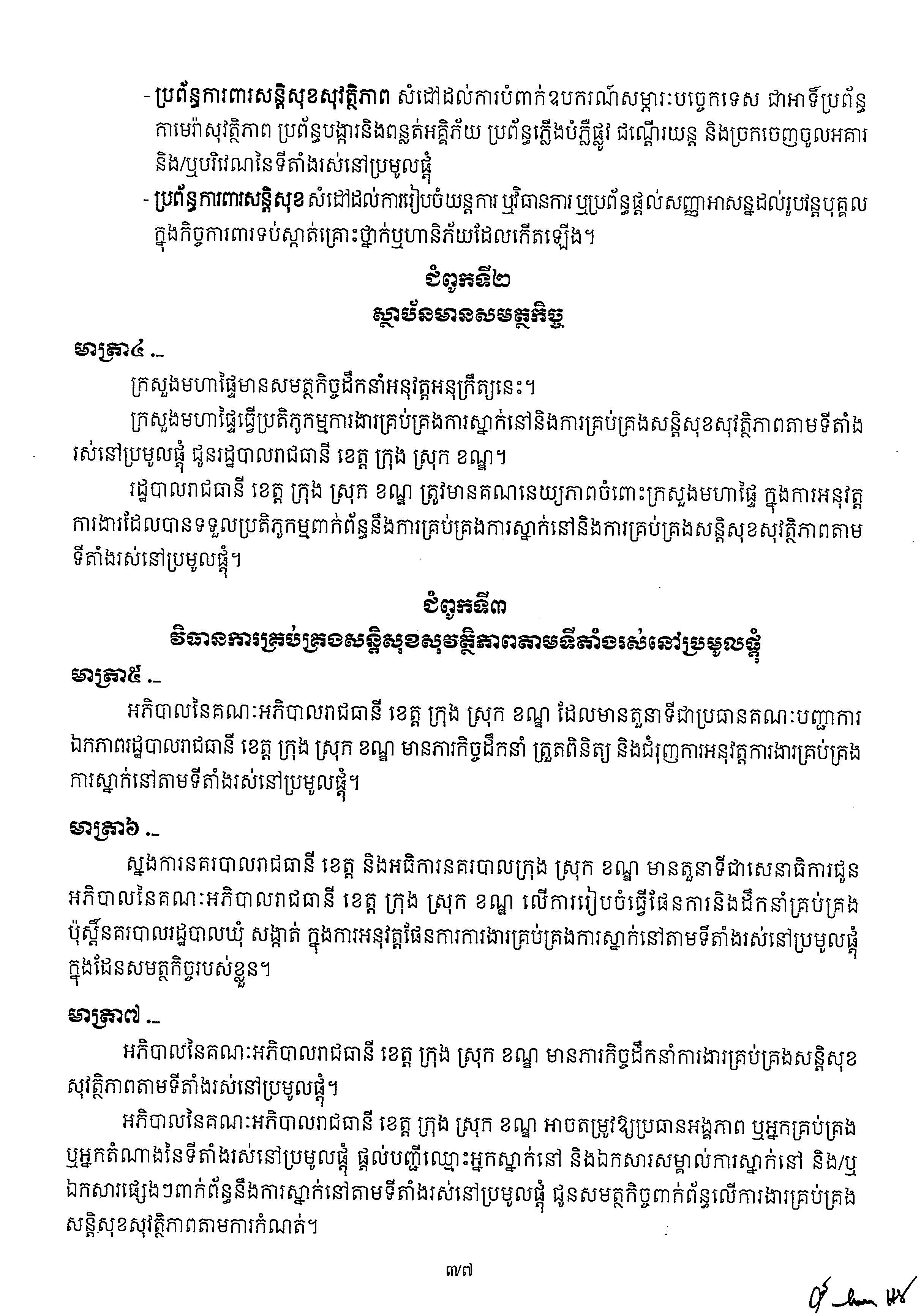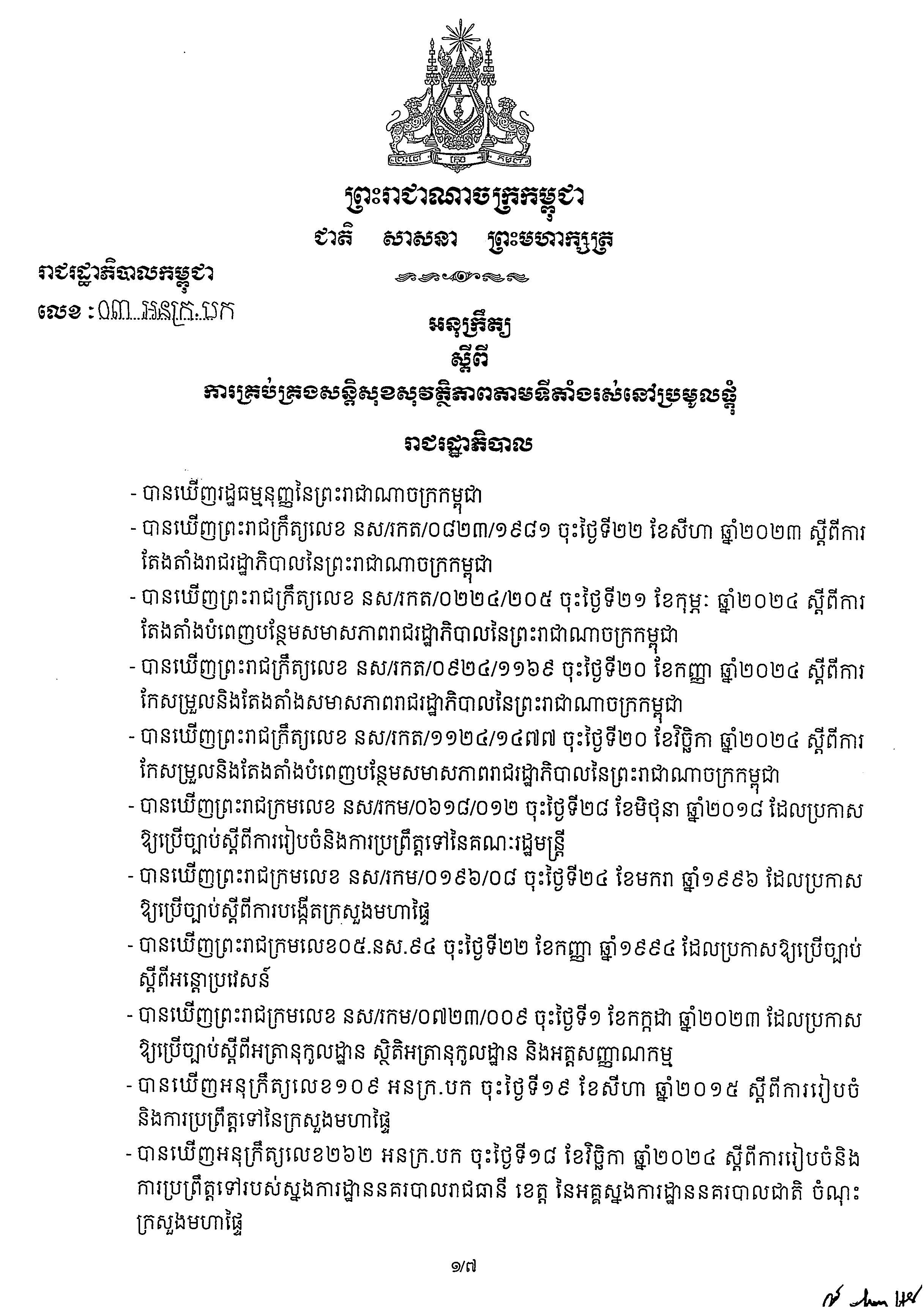 សូមជម្រាបថា អនុក្រឹត្យស្ដីពីការគ្រប់គ្រងសន្ដិសុខសុវត្ថិភាព តាមទីតាំងរស់នៅប្រមូលផ្ដុំ ត្រូវបានបង្កើតឡើងដើម្បីធានាសន្ដិសុខ សុវត្ថិភាពសង្គម និងសណ្ដាប់ធ្នាប់សាធារណៈ៕