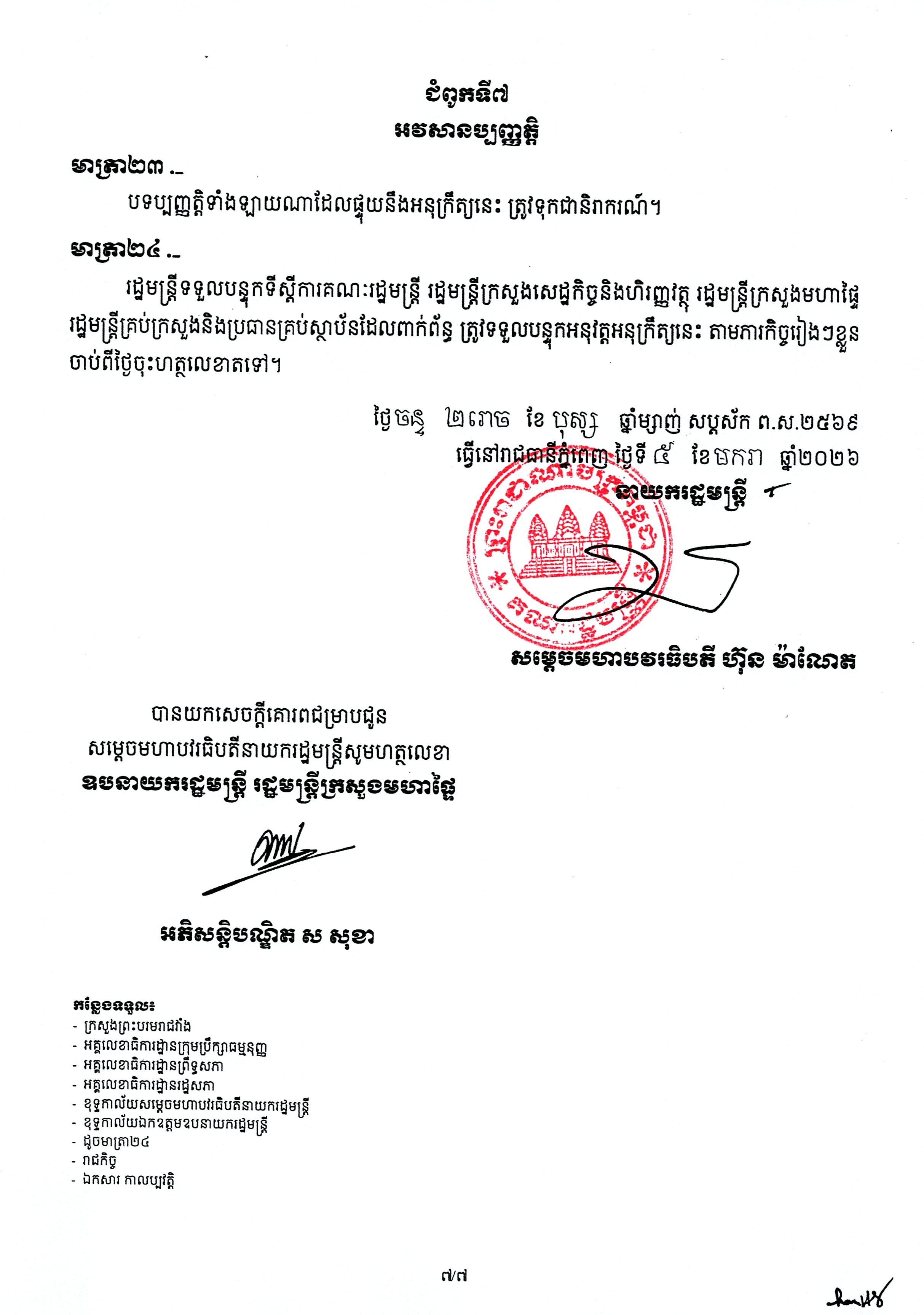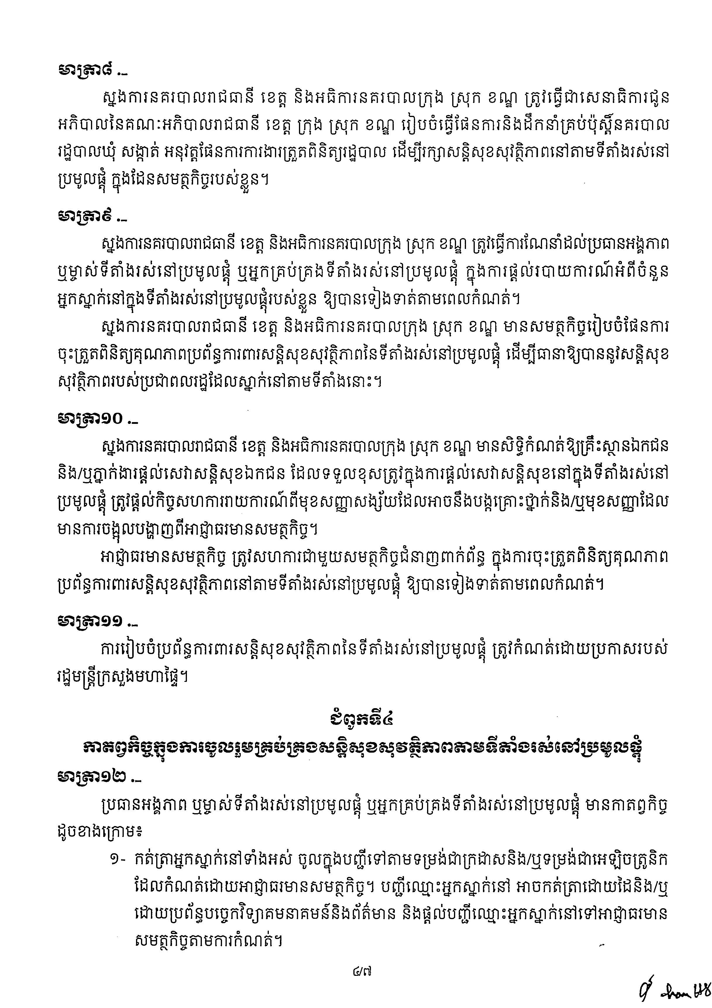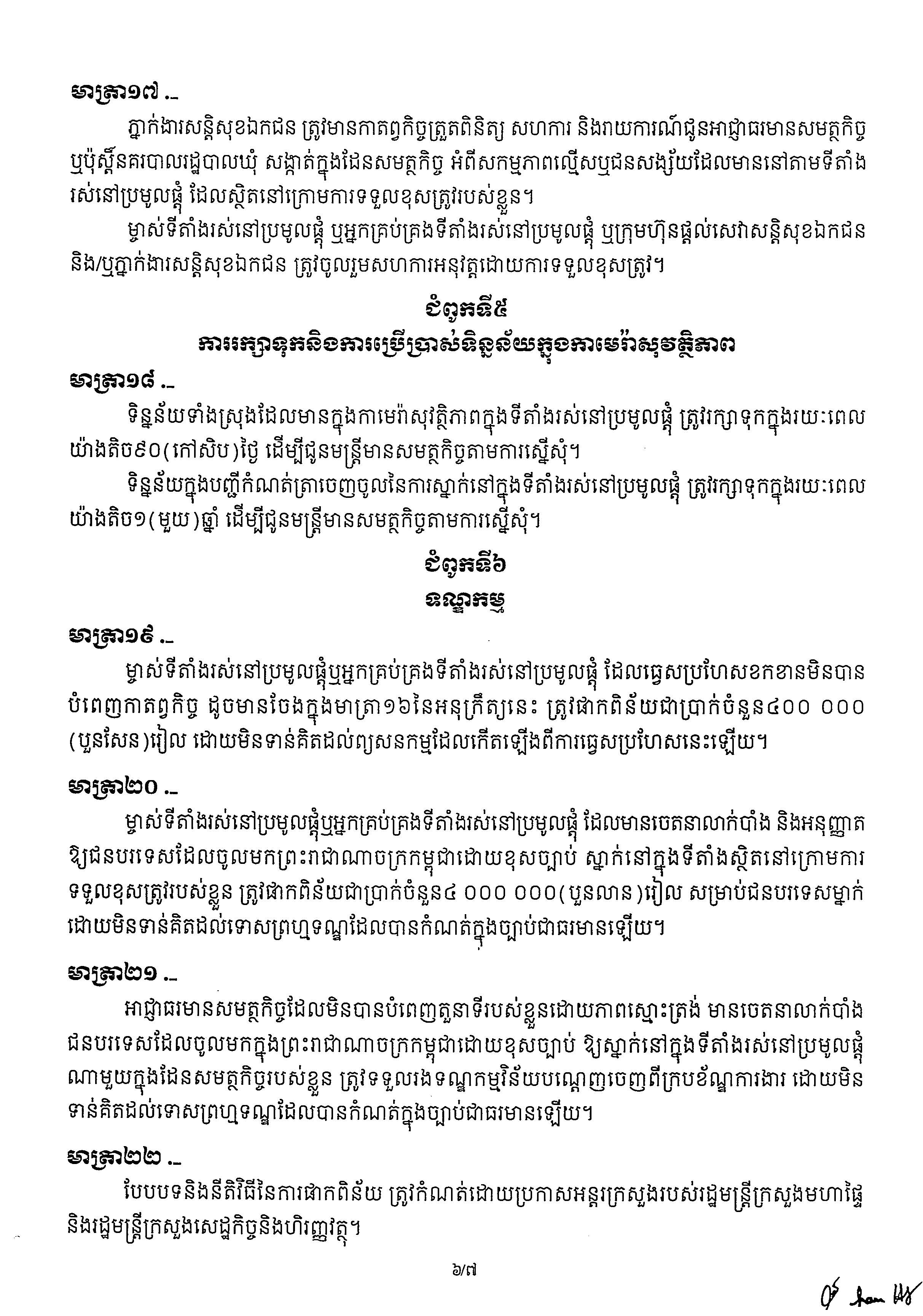ក្នុងអនុក្រឹត្យរបស់រាជរដ្ឋាភិបាលស្ដីពីការគ្រប់គ្រងសន្ដិសុខសុវត្ថិភាពតាមទីតាំងរស់នៅប្រមូលផ្ដុំ បានកំណត់ថា អាជ្ញាធរមានសមត្ថកិច្ចដែលមិនបានបំពេញតួនាទីរបស់ខ្លួនដោយស្មោះត្រង់ មានចេតនាលាក់បាំង ជនបរទេសចូលមកក្នុងប្រទេសកម្ពុជាដោយខុសច្បាប់ ឲ្យស្នាក់នៅក្នុងទីតាំងរស់នៅប្រមូលផ្ដុំណាមួយក្នុងដែនសមត្ថកិច្ចរបស់ខ្លួន ត្រូវទទួលរងទណ្ឌកម្មវិន័យបណ្ដេញចេញពីក្របខ័ណ្ឌការងារ ដោយមិនទាន់គិតដល់ទោស ព្រហ្មទណ្ឌដែលបានកំណត់ក្នុងច្បាប់ជាធរមានឡើយ។