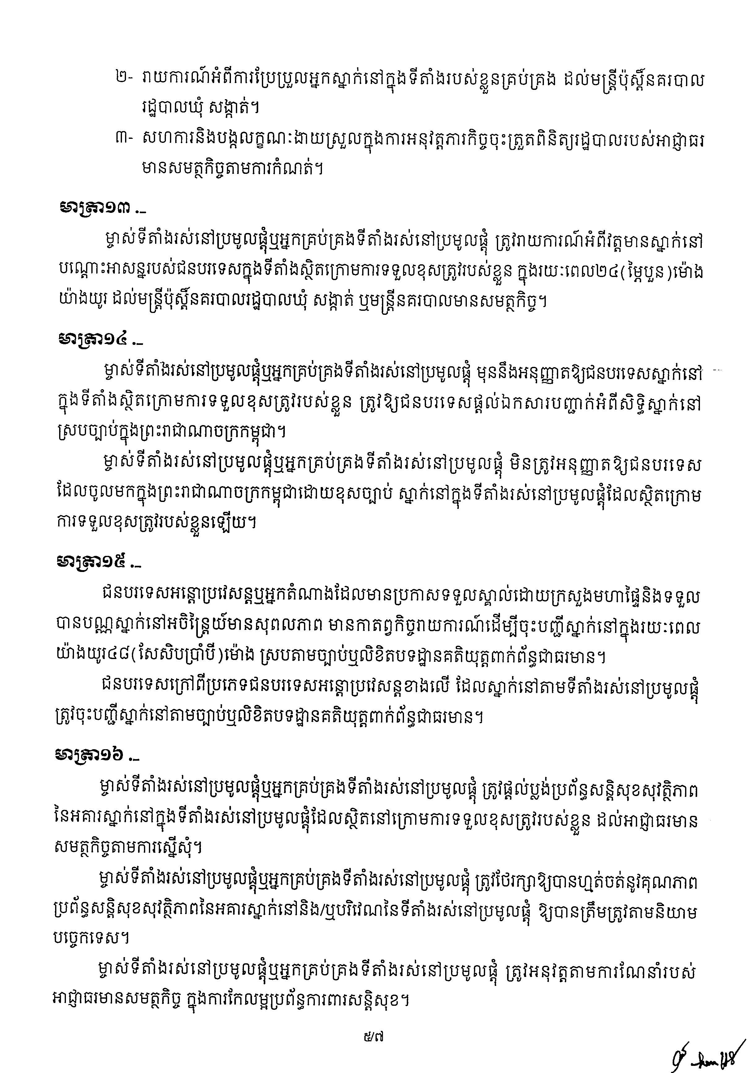 ម្ចាស់ទីតាំងរស់នៅប្រមូលផ្តុំ ឬអ្នកគ្រប់គ្រងទីតាំងរស់នៅប្រមូលផ្តុំ ត្រូវរាយការណ៍អំពីវត្តមានស្នាក់នៅ បណ្តោះអាសន្នរបស់ជនបរទេសក្នុងទីតាំងស្ថិតក្រោមការទទួលខុសត្រូវរបស់ខ្លួន ក្នុងរយៈពេល២៤ម៉ោង យ៉ាងយូរ ដល់មន្ត្រីប៉ុស្តិ៍នគរបាលរដ្ឋបាលឃុំ សង្កាត់ ឬមន្ត្រីនគរបាលមានសមត្ថកិច្ច។