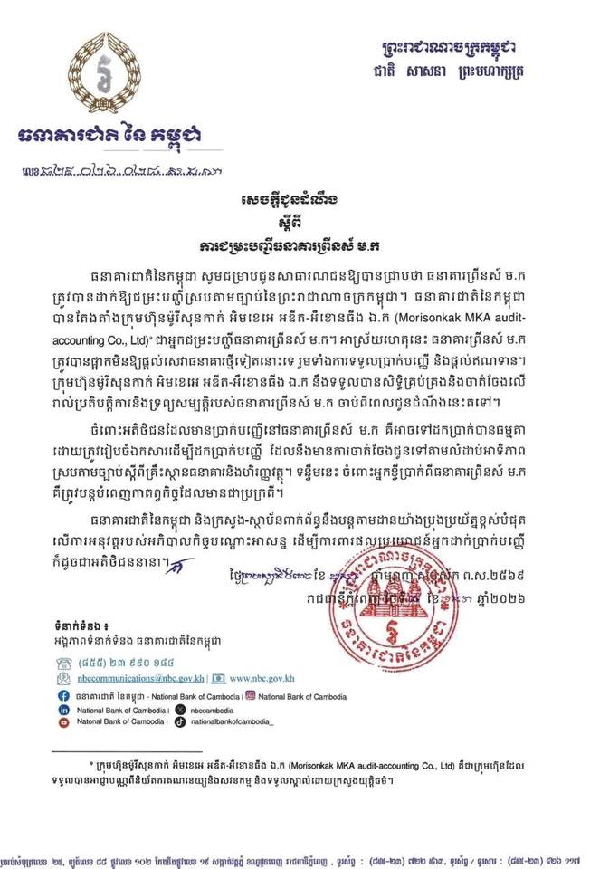 ធនាគារជាតិនៃកម្ពុជា បានបញ្ជាក់បន្ថែមថា ខ្លួននឹងសហការជាមួយក្រសួង និងស្ថាប័នពាក់ព័ន្ធ ដើម្បី តាមដានយ៉ាងប្រុងប្រយ័ត្នខ្ពស់បំផុត លើការអនុវត្តនៃអភិបាលកិច្ចបណ្តោះអាសន្ន ក្នុងគោលបំណងការពារ ផលប្រយោជន៍អ្នកដាក់ប្រាក់បញ្ញើ និងអតិថិជនទាំងអស់។