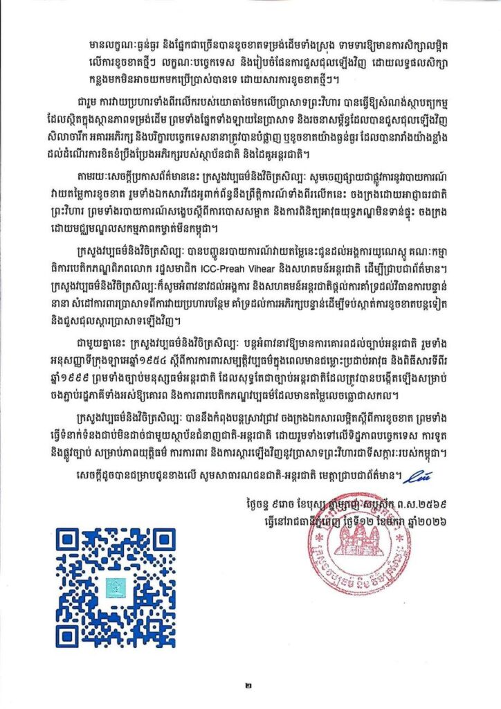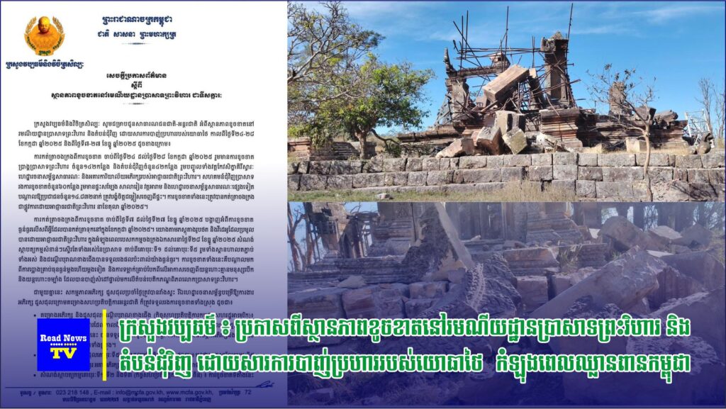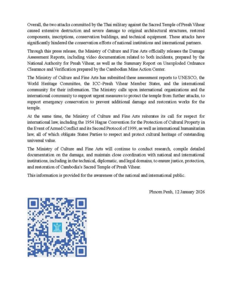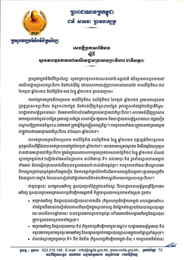 ក្រសួងវប្បធម៌ និងវិចិត្រសិល្បៈ បានចេញសេចក្តីប្រកាសព័ត៌មាន នៅថ្ងៃទី ១២ ខែមករា ឆ្នាំ ២០២៦ បង្ហាញអំពីស្ថានភាពខូចខាតយ៉ាងធ្ងន់ធ្ងរ នៅរមណីយដ្ឋានប្រាសាទព្រះវិហារ និងតំបន់ជុំវិញ បណ្តាលមកពីការបាញ់ប្រហាររបស់យោធាថៃ ក្នុងអំឡុងពីរដំណាក់កាលធំៗ គឺចន្លោះថ្ងៃទី ២៤–២៨ ខែកក្កដា ឆ្នាំ ២០២៥ និងថ្ងៃទី ៧–២៧ ខែធ្នូ ឆ្នាំ ២០២៥។