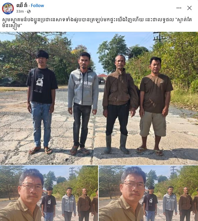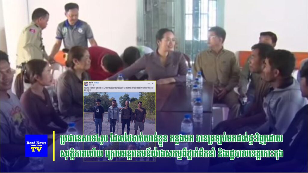ប្រជានេសាទខ្មែរ ៤នាក់ ដែលត្រូវបានកងទ័ពជើងទឹកថៃ ចាប់ខ្លួន កាលពីថ្ងៃទី៦ ខែមករា កន្លងទៅ បានវិលត្រឡប់មកមាតុភូមិវិញហើយ។ នេះបើតាមការបញ្ជាក់របស់ លោកជំទាវ ឈី វ៉ា អភិបាលខេត្តកោះកុង បញ្ជាក់ប្រាប់បណ្តាញសារព័ត៌មាន ក្នុងស្រុកនៅថ្ងៃទី១១ ខែមករា ឆ្នាំ២០២៦។