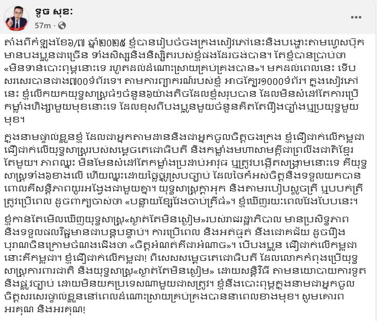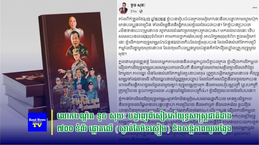 លោកបណ្ឌិត ទូច សុឃៈ បានបង្ហាញថា ចាប់តាំងពីខែមិថុនា–កក្កដា ឆ្នាំ២០២៥ មក លោកបានចាប់ផ្តើមរៀបចំ និងចងក្រងសៀវភៅវិភាគយុទ្ធសាស្ត្រជាតិមួយ ដែលបច្ចុប្បន្នបានសរសេររួចជាង ៧០០ ទំព័រ ហើយអាចឈានដល់ប្រមាណ ១,០០០ ទំព័រ នៅពេលបញ្ចប់។