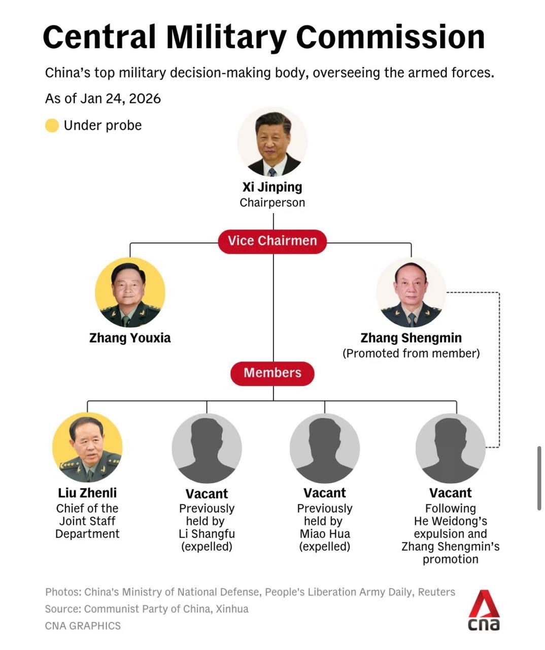 បច្ចុប្បន្ន ស្ថាប័នដឹកនាំយោធាកំពូលចិន ដែលមានសមាជិក ៧ រូប ត្រូវបានរាយការណ៍ថា នៅសល់តែ ២ រូបប៉ុណ្ណោះដែលកំពុងបំពេញភារកិច្ច ដោយមានលោកប្រធានាធិបតី ស៊ី ជីនពីង ស្ថិតនៅកំពូលអំណាច។