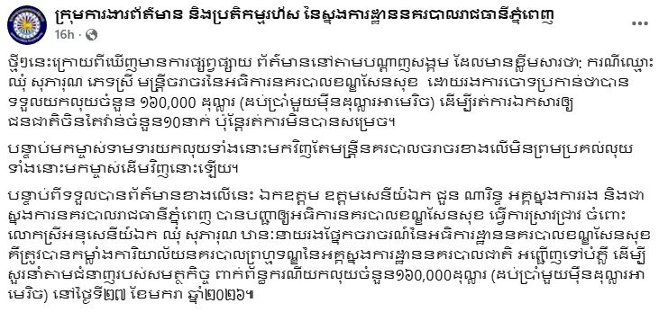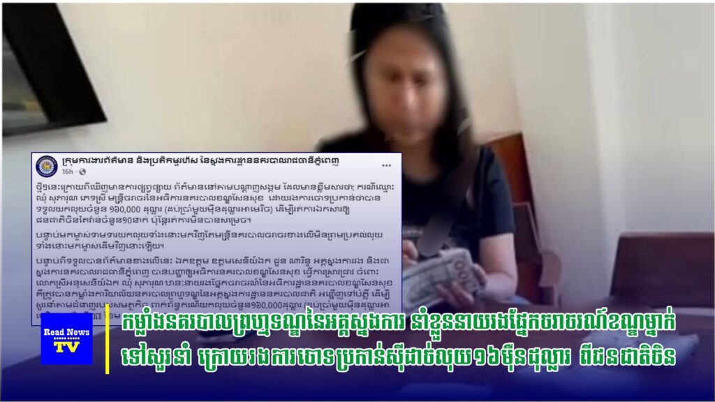 កម្លាំងនគរបាលព្រហ្មទណ្ឌនៃអគ្គស្នងការដ្ឋាននគរបាលជាតិ បាននាំខ្លួននាយរងផ្នែកចរាចរណ៍នៃអធិការដ្ឋាននគរបាលខណ្ឌសែនសុខម្នាក់ទៅសួរនាំ ក្រោយរងការចោទប្រកាន់ថា ស៊ីដាច់លុយ ១៦ម៉ឺនដុល្លារ ពីជនជាតិចិន។