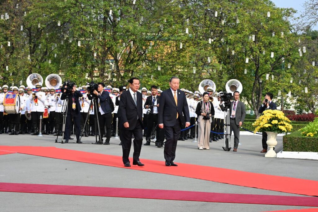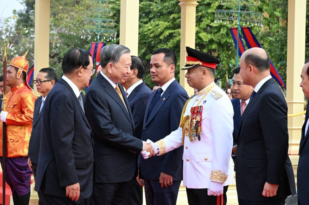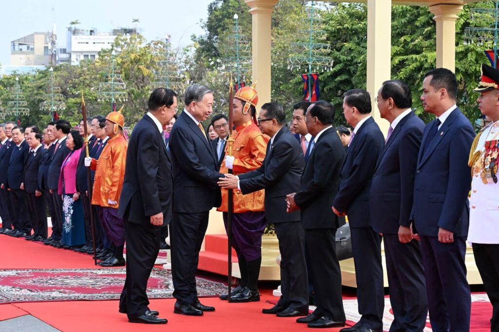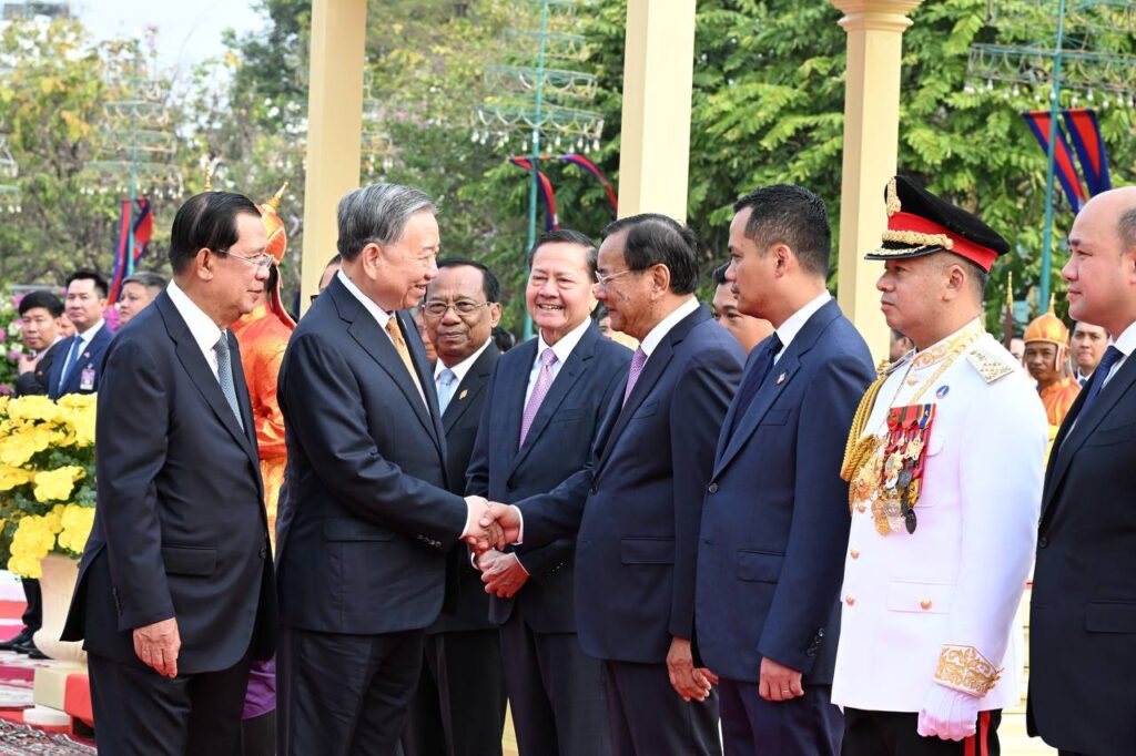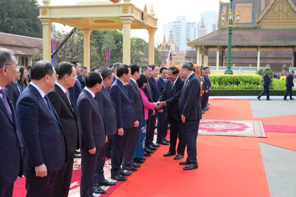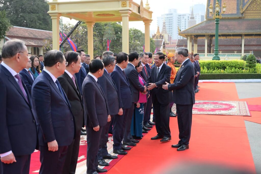 នៅព្រះបរមរាជវាំង នាព្រឹកថ្ងៃសុក្រ ៤រោច ខែមាឃ ឆ្នាំម្សាញ់ សប្តស័ក ពុទ្ធសករាជ ២៥៦៩ ត្រូវនឹងថ្ងៃទី៦ ខែកុម្ភៈ ឆ្នាំ២០២៦នេះ សម្ដេចអគ្គមហាសេនាបតីតេជោ ហ៊ុន សែន ប្រធានព្រឹទ្ធសភានៃព្រះរាជាណាចក្រកម្ពុជា បានអញ្ជើញជាព្រះរាជតំណាងដ៏ខ្ពង់ខ្ពស់បំផុត របស់ព្រះករុណាព្រះបាទសម្ដេចព្រះបរមនាថ នរោត្តម សីហមុនី ព្រះមហាក្សត្រនៃព្រះរាជាណាចក្រកម្ពុជា ទទួលបដិសណ្ឋារកិច្ចស្វាគមន៍ផ្លូវរដ្ឋជូន ឯកឧត្តម តូ ឡឹម អគ្គលេខាធិការបក្សកុម្មុយនីស្តវៀតណាម ជាមួយនឹងជំនួបសាវនាកាផងដែរ ក្នុងឱកាសដែល ឯកឧត្តម អញ្ជើញបំពេញទស្សនកិច្ចផ្លូវរដ្ឋនៅកម្ពុជា។