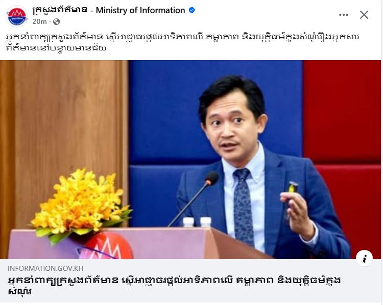 ឯកឧត្តម ទេព អស្នារិទ្ធ អនុរដ្ឋលេខាធិការ និងអ្នកនាំពាក្យ ក្រសួងព័ត៌មាន បានមានប្រសាសន៍នៅថ្ងៃទី១៣ ខែកុម្ភៈ ឆ្នាំ២០២៦ ថា ក្រសួងព័ត៌មានបានសហការជាមួយអាជ្ញាធរសមត្ថកិច្ចពាក់ព័ន្ធ ដើម្បីទទួលព័ត៌មានបន្ថែម និងពិនិត្យស្វែងយល់អំពីអង្គហេតុ និងអង្គច្បាប់ពាក់ព័ន្ធនឹងករណីអ្នកសារព័ត៌មាននៅ បន្ទាយមានជ័យ នេះ។