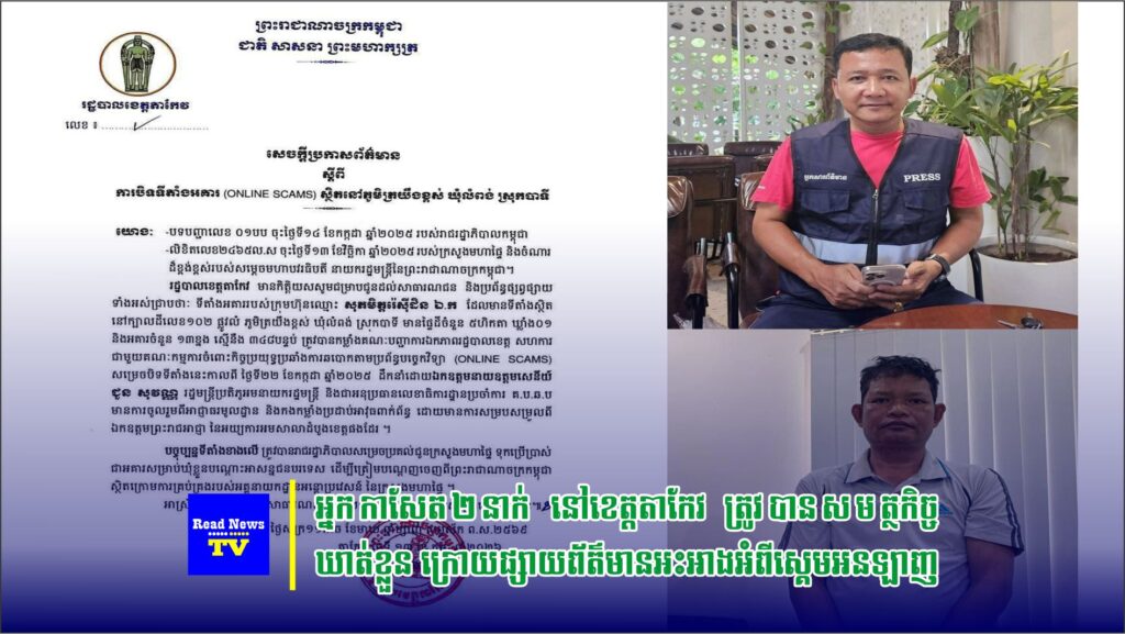 អ្នកកាសែតចំនួន២នាក់នៅ ខេត្តតាកែវ ត្រូវបានកម្លាំងសមត្ថកិច្ចឃាត់ខ្លួន នៅថ្ងៃទី១២ ខែកុម្ភៈ ឆ្នាំ២០២៦ ក្រោយពីមានការផ្សាយព័ត៌មានដែលអាជ្ញាធរអះអាងថា ជាព័ត៌មានមិនពិត អំពីការអះអាងថា ខេត្តតាកែវមានទីតាំងស្គេមអនឡាញ។