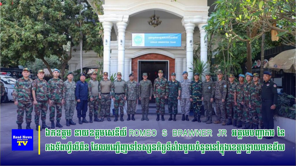 លោកជំទាវ ឧត្តមសេនីយ៍ឯក ម៉ាលី សុជាតា អ្នកនាំពាក្យក្រសួងការពារជាតិ នៃព្រះរាជាណាចក្រកម្ពុជា បានឱ្យដឹងថា នៅថ្ងៃទី១៣ ខែកុម្ភៈ ឆ្នាំ២០២៦នេះ ក្រុមសម្របសម្រួល (CLG) នៃព្រះរាជាណាចក្រកម្ពុជា បានសម្របសម្រួលជូនដល់ក្រុមអ្នកសង្កេតការណ៍អាស៊ាន (AOT) ទទួលស្វាគមន៍ ឯកឧត្តម នាយឧត្តមសេនីយ៍ ROMEO S BRAWNER JR អគ្គមេបញ្ជាការ នៃកងទ័ពហ្វីលីពីន ដែលអញ្ជើញទៅទស្សនកិច្ចទីតាំងមួយចំនួននៅក្នុងខេត្តបន្ទាយមានជ័យ។ គណៈប្រតិភូបានអញ្ជើញទៅទស្សនកិច្ចស្នាក់ការ២ ស្ថិតនៅក្រុងសិរីសោភ័ណ ដោយក្នុងឱកាសនោះ វរសេនីយ៍ឯក MOHD FARID BIN MOHD YUSOP ប្រធានក្រុមអ្នកសង្កេតការណ៍អាស៊ាន (AOT) ប្រចាំកម្ពុជាក៏បានធ្វើបទបង្ហាញជូនឯកឧត្តម អគ្គមេបញ្ជាការ និងគណៈប្រតិភូ ស្តីពីវឌ្ឍនភាពការងាររបស់ខ្លួនផងដែរ។