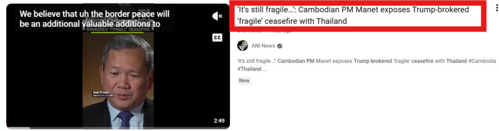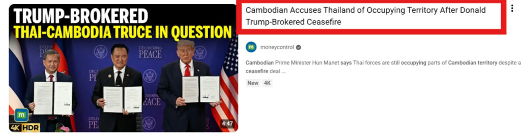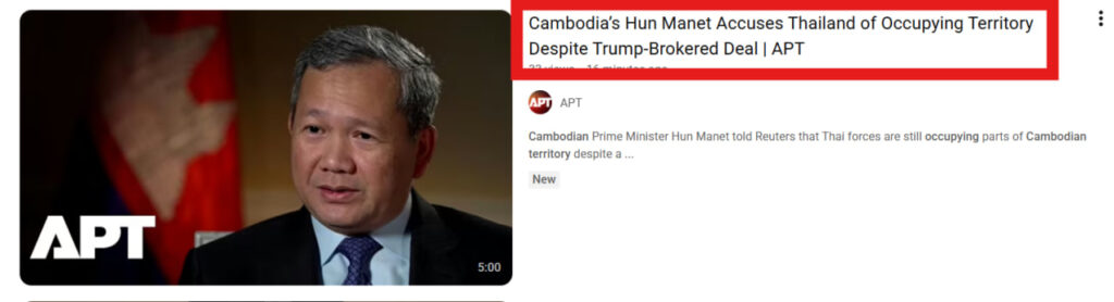 ក្នុងបទសម្ភាសនេះ សម្តេចធិបតីបានថ្លែងថា កងកម្លាំង ថៃ កំពុងកាន់កាប់ទឹកដីរបស់ កម្ពុជា ដោយខុសច្បាប់អន្តរជាតិ ទោះបីជាមុននេះមានកិច្ចព្រមព្រៀងសន្តិភាពមួយ ដែលមានការសម្របសម្រួលដោយប្រធានាធិបតីសហរដ្ឋអាម៉េរិក ដូណាល់ ត្រាំ ក៏ដោយ។