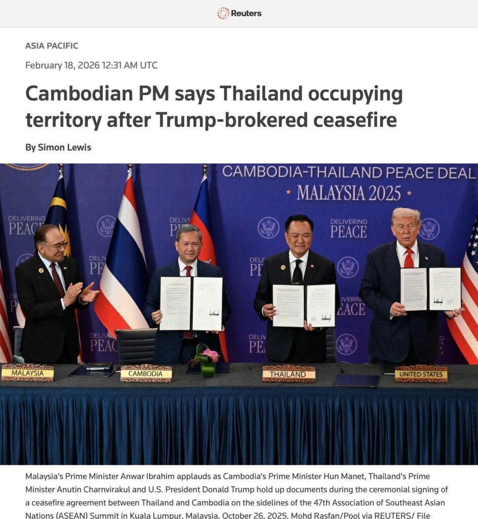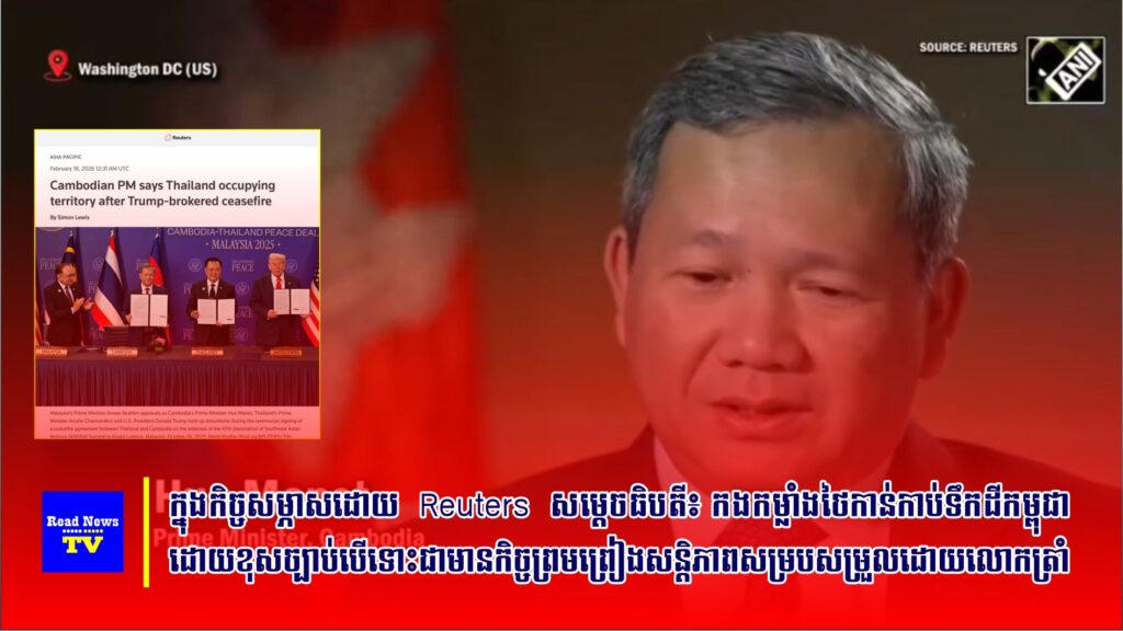 សម្តេចធិបតីនាយករដ្ឋមន្ត្រីកម្ពុជា បានផ្តល់បទសម្ភាសផ្តាច់មុខមួយជូនដល់ទីភ្នាក់ងារសារព័ត៌មានអន្តរជាតិ Reuters អំឡុងពេលដំណើរទស្សនកិច្ចផ្លូវការនៅ សហរដ្ឋអាម៉េរិក ដោយលើកឡើងអំពីស្ថានភាពព្រំដែនកម្ពុជា–ថៃ និងប្រធានបទសំខាន់ៗមួយចំនួនទៀត នៅថ្ងៃទី១៧ ខែកុម្ភៈ ឆ្នាំ២០២៦ ។