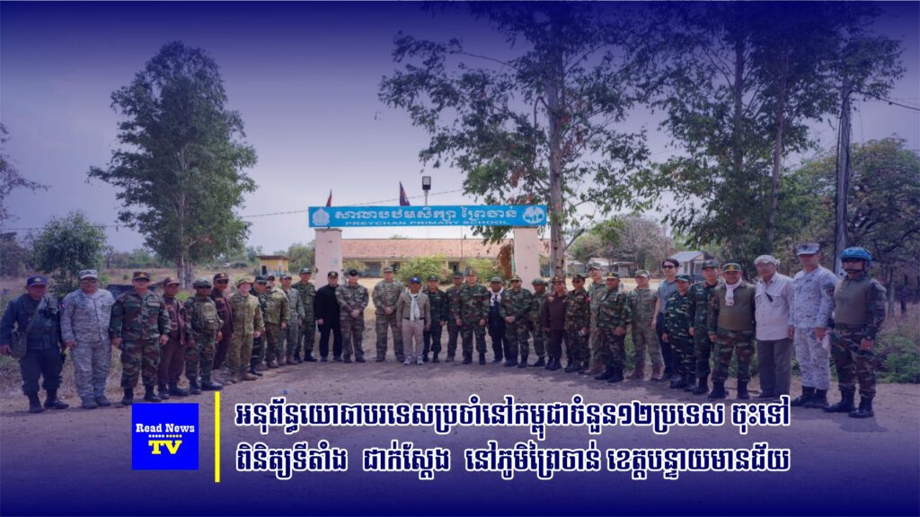 លោកជំទាវឧត្តមសេនីយ៍ឯក ម៉ាលី សុជាតា អ្នកនាំពាក្យក្រសួងការពារជាតិ នៃព្រះរាជាណាចក្រកម្ពុជាបានថ្លែងថា នៅថ្ងៃទី៤ ខែមីនា ឆ្នាំ២០២៦ ក្រសួងការពារជាតិ បានសម្របសម្រួលជូនប្រតិភូអនុព័ន្ធយោធាបរទេស ប្រចាំព្រះរាជាណាចក្រកម្ពុជាចំនួន ១២ប្រទេស ចុះទៅពិនិត្យទីតាំងជាក់ស្តែងនៅភូមិព្រៃចាន់ ឃុំអូរបីជាន់ ស្រុកអូរជ្រៅ ខេត្តបន្ទាយមានជ័យ ។