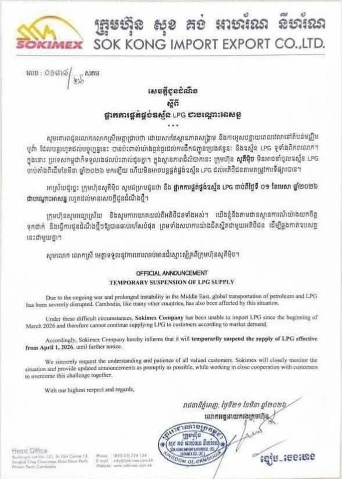 ឯកឧត្តម សង្កត់ធ្ងន់ថា ទោះបីជាក្រុមហ៊ុនសូគីមិចបិទដំណើរការនៅខែមេសាក៏ដោយ ប៉ុន្តែកម្ពុជា នឹងមិនខ្វះឧស្ម័នផ្គត់ផ្គង់នោះទេ ព្រោះក្រុមហ៊ុនសូគីមិចមានការផ្គត់ផ្គង់នៅទូទាំងប្រទេសតែ៣%ប៉ុណ្ណោះ ។ ដូច្នេះ ឯកឧត្តមបានស្នើទៅកាន់ប្រជាពលរដ្ឋ កុំមានការភ័យព្រួយបារម្ភ ។