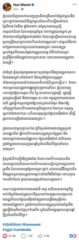 តាមរយៈសំណេរបង្ហោះលើបណ្តាញសង្គមផ្លូវការ នៅព្រឹកថ្ងៃទី៣១ ខែមីនា ឆ្នាំ២០២៦នេះ សម្តេចបវរធិបតី ហ៊ុន ម៉ាណែត នាយករដ្ឋមន្ត្រីនៃកម្ពុជា បានចេញបទបញ្ជាឱ្យឧបនាយករដ្ឋមន្ត្រី កើត រិទ្ធ រដ្ឋមន្ត្រីក្រសួងយុត្តិធម៌ និងនាយឧត្តមសេនីយ៍ ស ថេត អគ្គស្នងការនគរបាលជាតិ ធ្វើការស្រាវជ្រាវឱ្យបានហ្មត់ចត់បំផុត និងរកឱ្យឃើញអ្នកបើកបររថយន្តពិតប្រាកដ ដែលបុកមនុស្សស្លាប់ទាំង៦នាក់ នៅស្រុកមោងឬស្សី ខេត្តបាត់ដំបង ដើម្បីផ្តល់យុត្តិធម៌ដល់ជនរងគ្រោះ។