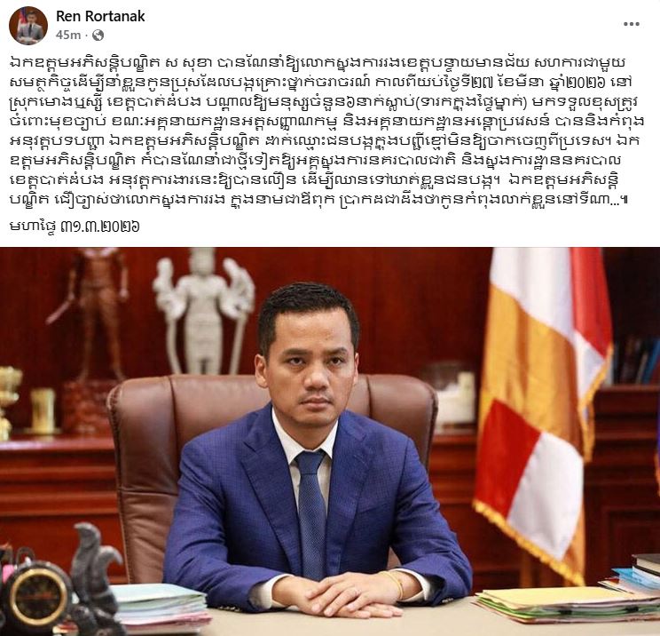 ” ឯកឧត្តមអភិសន្តិបណ្ឌិត ស សុខា បានណែនាំឱ្យលោកស្នងការរងខេត្តបន្ទាយមានជ័យ សហការជាមួយសមត្ថកិច្ចដើម្បីនាំខ្លួនកូនប្រុសដែលបង្កគ្រោះថ្នាក់ចរាចរណ៍ កាលពីយប់ថ្ងៃទី២៧ ខែមីនា ឆ្នាំ២០២៦ នៅស្រុកមោងឬស្សី ខេត្តបាត់ដំបង បណ្ដាលឱ្យមនុស្សចំនួន៦នាក់ស្លាប់(ទារកក្នុងផ្ទៃម្នាក់) មកទទួលខុសត្រូវចំពោះមុខច្បាប់ ខណៈអគ្គនាយកដ្ឋានអត្តសញ្ញាណកម្ម និងអគ្គនាយកដ្ឋានអន្តោប្រវេសន៍ បាននិងកំពុងអនុវត្តបទបញ្ជា ឯកឧត្តមអភិសន្តិបណ្ឌិត ដាក់ឈ្មោះជនបង្កក្នុងបញ្ជីខ្មៅមិនឱ្យចាកចេញពីប្រទេស។ ឯកឧត្តមអភិសន្តិបណ្ឌិត ក៏បានណែនាំជាថ្មីទៀតឱ្យអគ្គស្នងការនគរបាលជាតិ និងស្នងការដ្ឋាននគរបាលខេត្តបាត់ដំបង អនុវត្តការងារនេះឱ្យបានលឿន ដើម្បីឈានទៅឃាត់ខ្លួនជនបង្ក។ ឯកឧត្តមអភិសន្តិបណ្ឌិត ជឿច្បាស់ថាលោកស្នងការរង ក្នុងនាមជាឪពុក ប្រាកដជាដឹងថាកូនកំពុងលាក់ខ្លួននៅទីណា…៕ ” ។